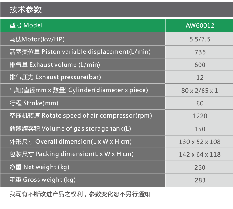 產品名稱:5.5kW 12bar 節能環保活塞式空壓機 AW60012