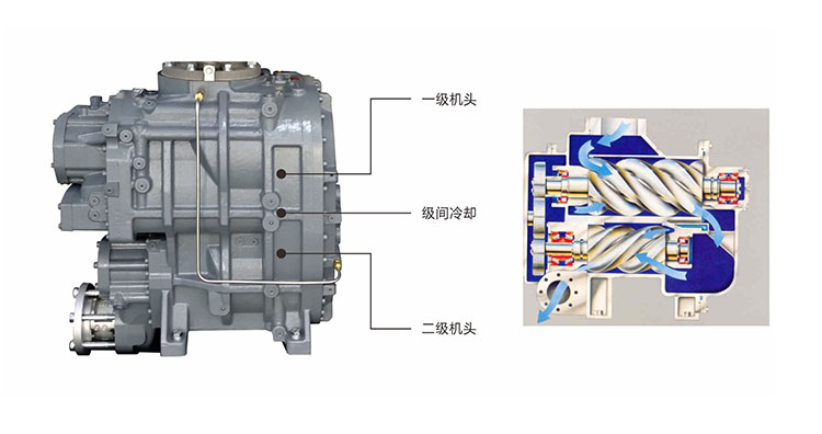 采用立體霧簾中間風冷降溫,實現了近似等溫,等壓比壓縮,比單級永磁變頻機組功率更低10-15%.